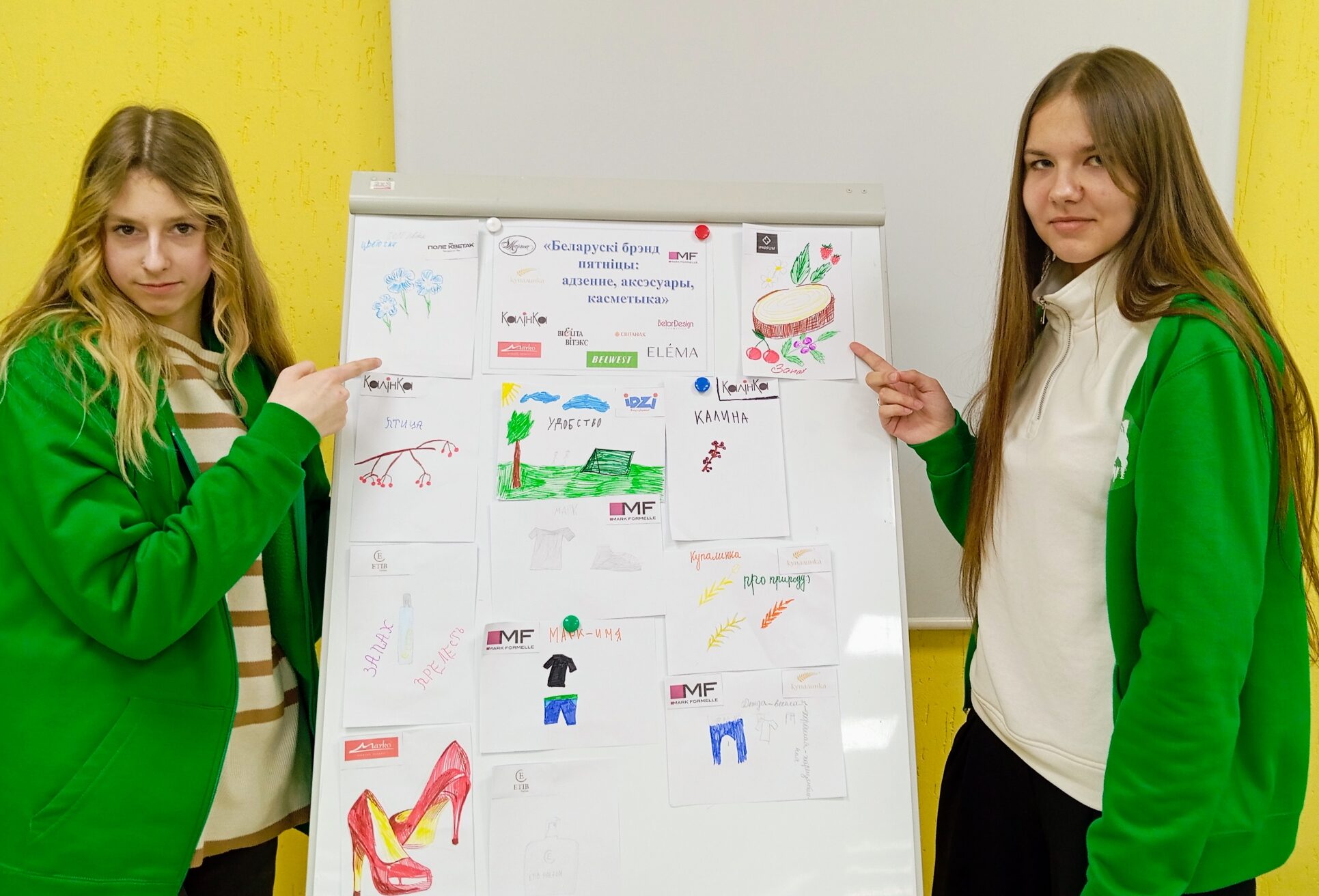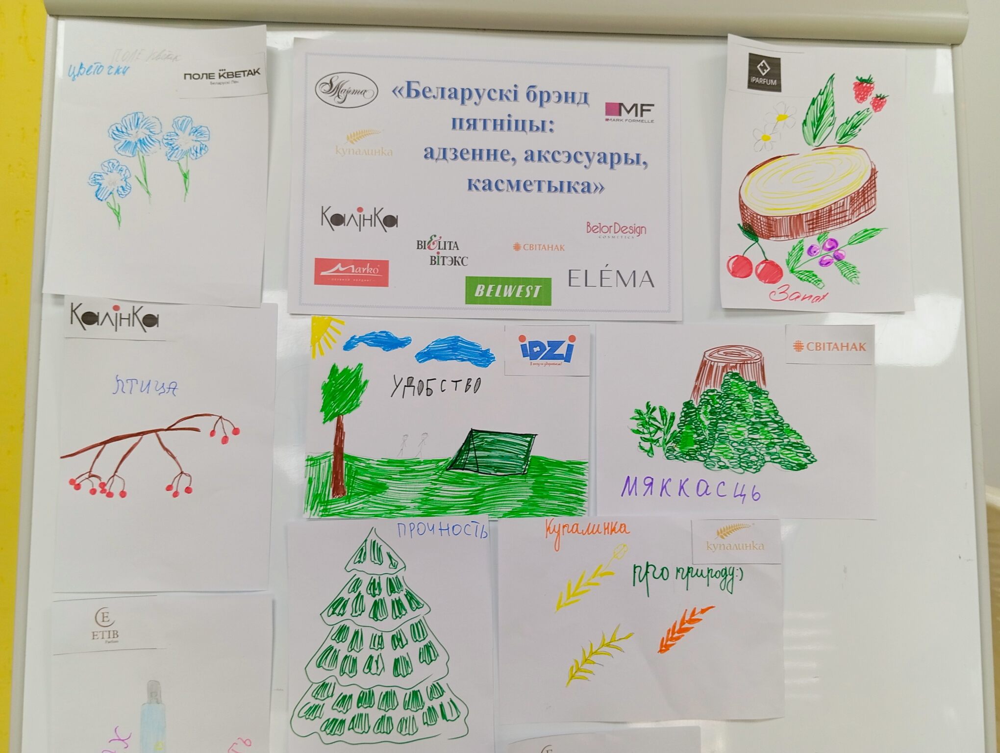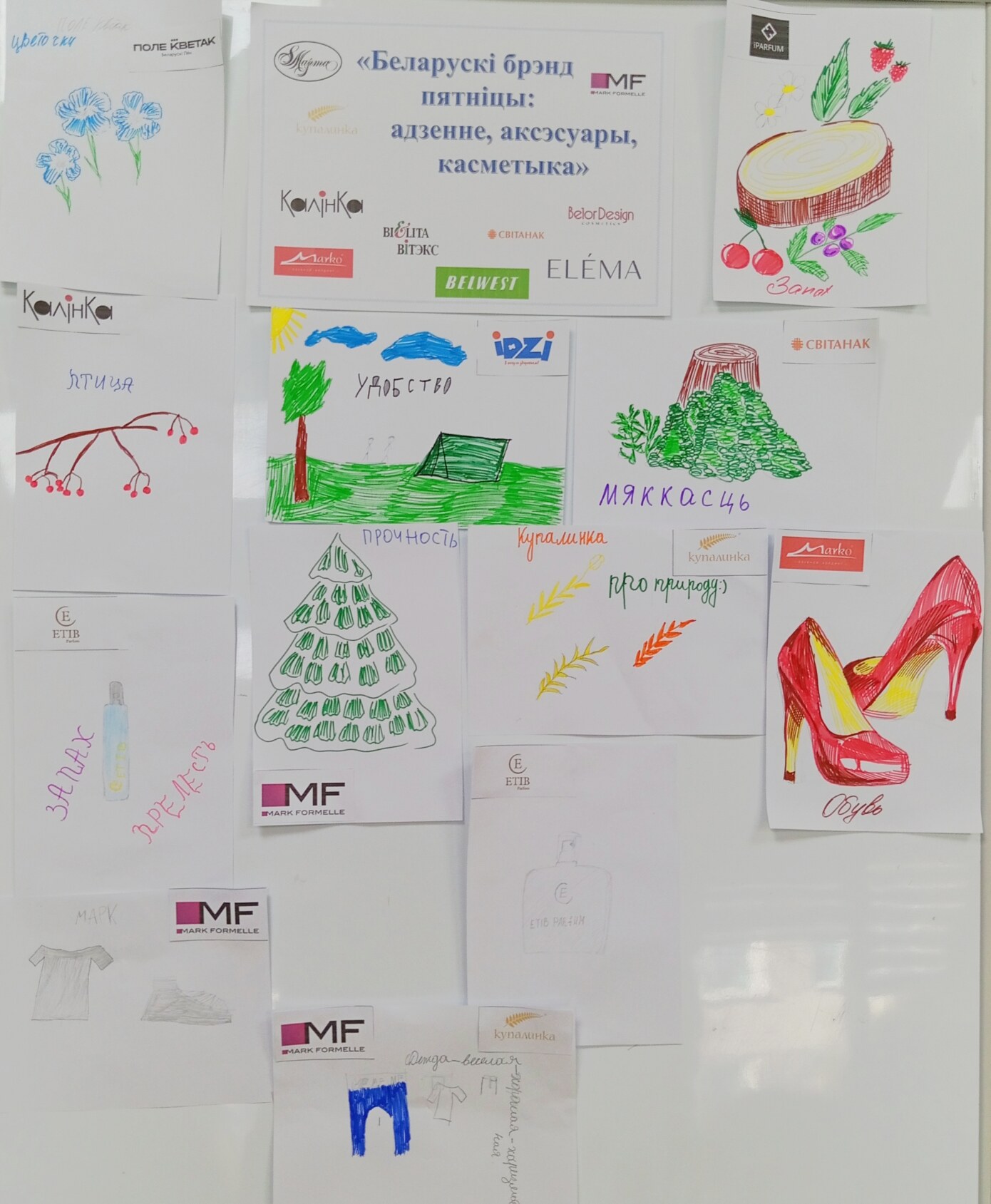 Каждому юному лесоводу было предложено выбрать свой любимый и узнаваемый белорусский бренд одежды, обуви или аромата. Далее задача усложнялась: нужно было написать слово-ассоциацию с этим брендом, а затем нарисовать эту ассоциацию!