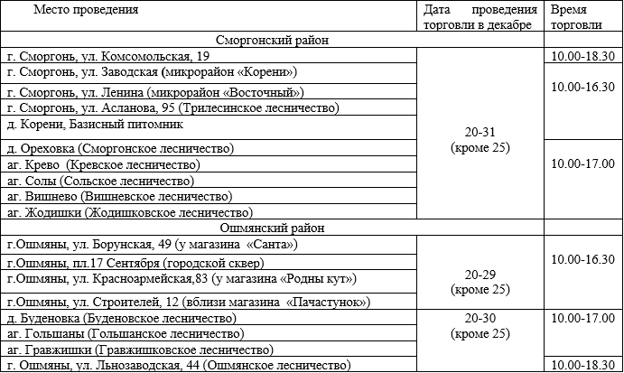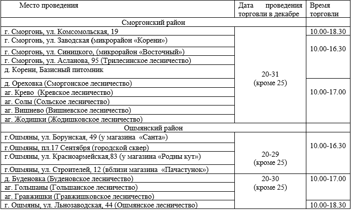 С 20 декабря в Сморгонском и Ошмянском районах начнут работу елочные базары. Сморгонский опытный лесхоз планирует реализовать около 3,5 тысяч новогодних деревьев. Традиционно на базарах будут представлены ели, сосны, ели в контейнерах и новогодние букеты.
