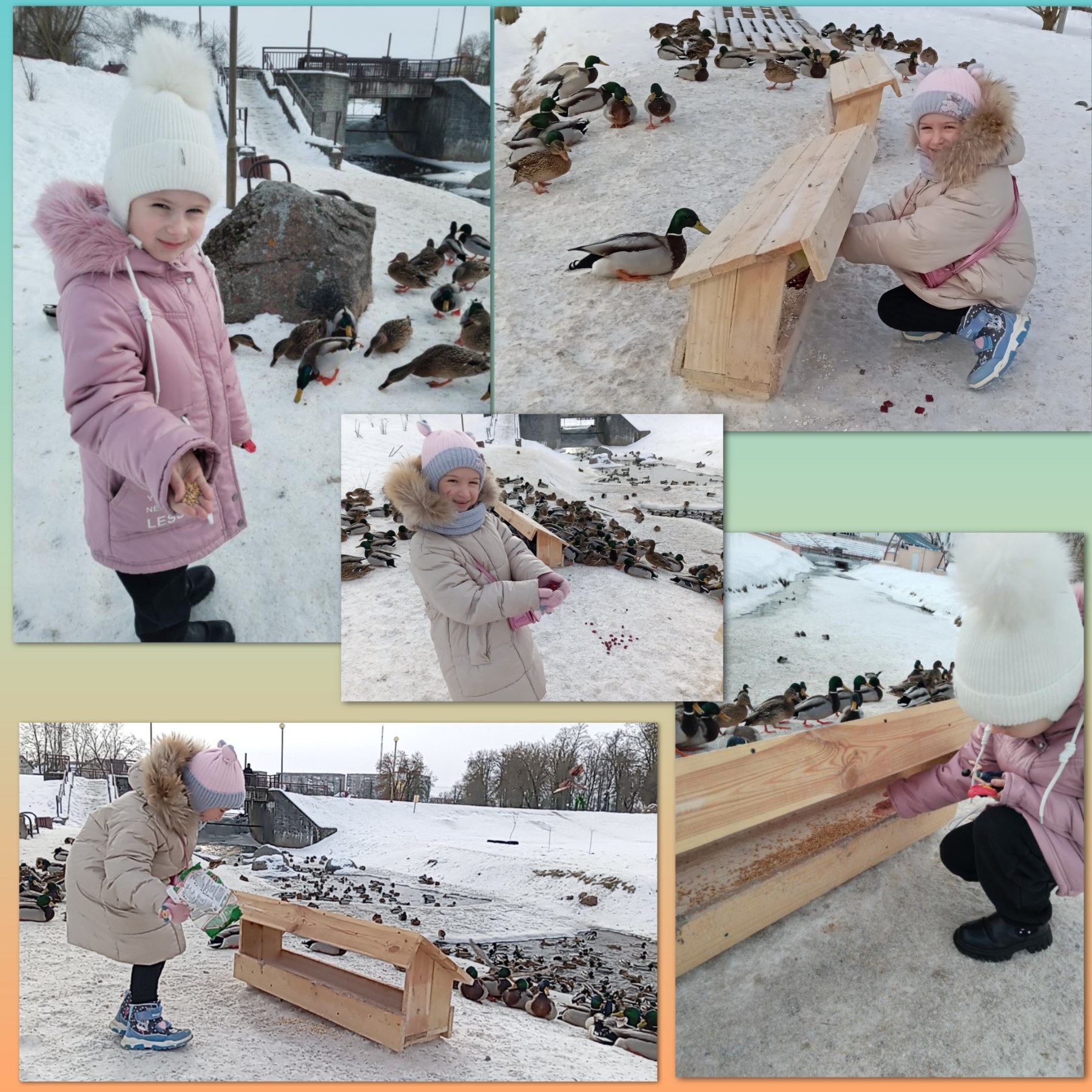 Девочки не просто подкормили селезней и уток, но и проследили за соблюдением «правильного меню»: вместо вредного хлеба они использовали полезные злаки (овес) и в прикормку свежий бурачок, порезанный на мелкие кубики.
