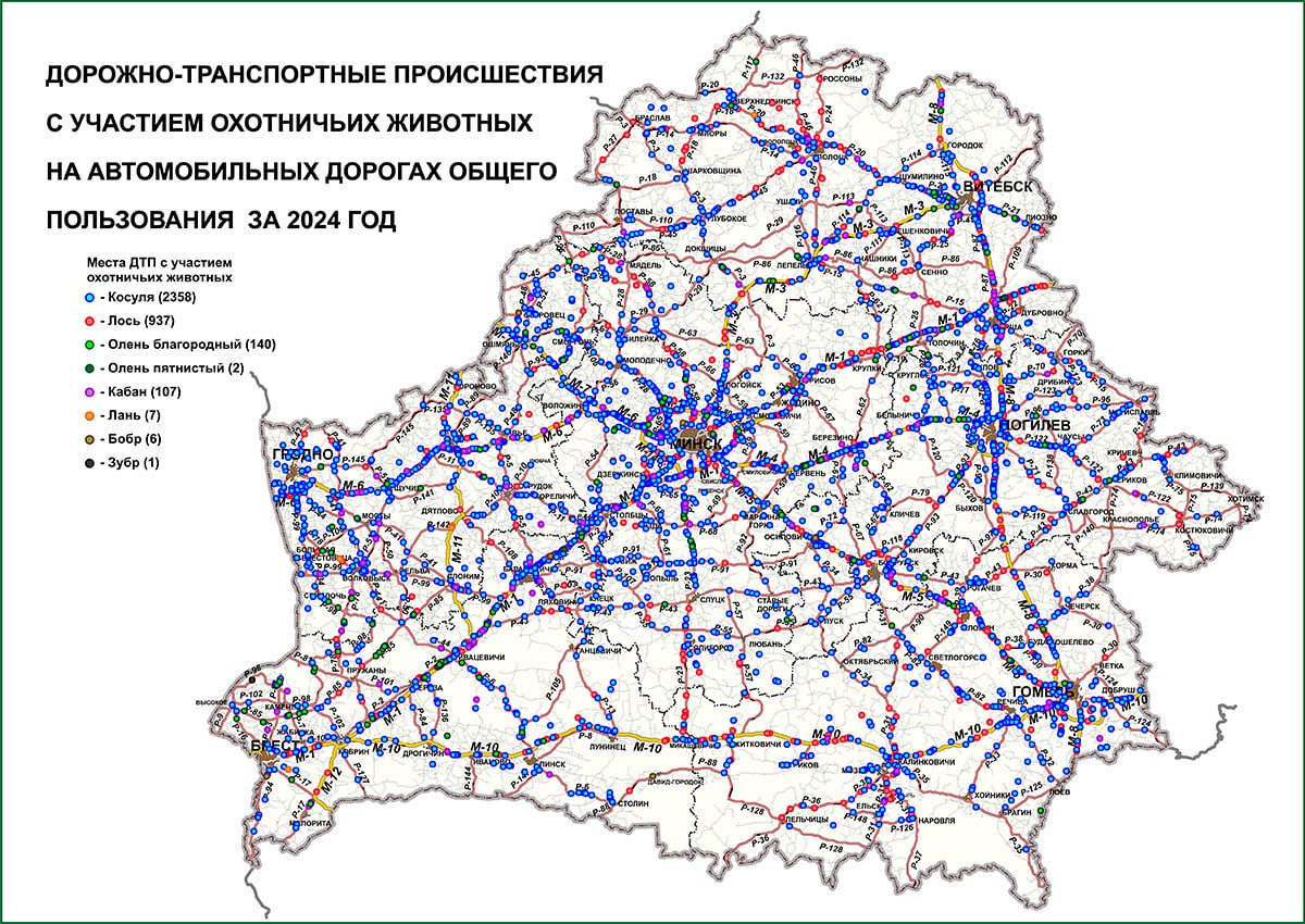 В Беларуси разработана карта-схема мест ДТП с участием диких животных. За основу были взяты данные за 2024-й год. Разработчиком карты выступил РУП «Белдорцентр».